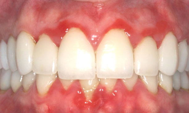 This patient is 21 years old. Although she has beautiful white crowns on her teeth, they were prepared and cemented below the gum line causing severe inflammation in her gums. This painful process has kept her from brushing and plaque is building making her inflammation worse.