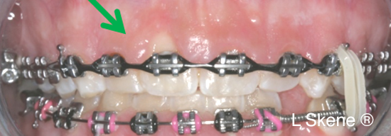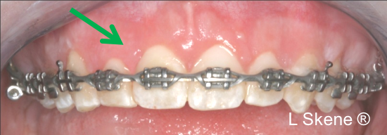This patient has excess gum tissue that is making it difficult to clean around her braces.